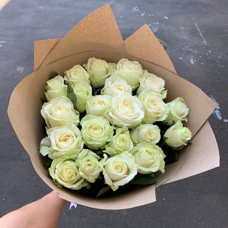 На фото букет из 19 белых роз. В составе: роза 19 шт, крафт-бумага 1 шт, атласная лента 1 шт, . Все цветы свежие и ароматные, букет красиво оформлен и отлично подходит для подарка. Доступна доставка цветов или самовывоз.